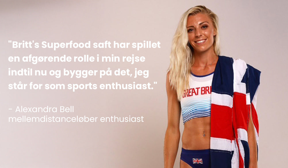 ”At komme sig hurtigere for at kunne yde sit bedste dag efter dag er altid en eftertragtet vej for enhver sports entusiast . Jeg føler mig heldig over at drikke Britt’s Superfoods juice i et stykke tid nu og kan mærke fordelene. Husk, du behøver ikke at være olympisk atlet for at sætte dit helbred som en topprioritet!”